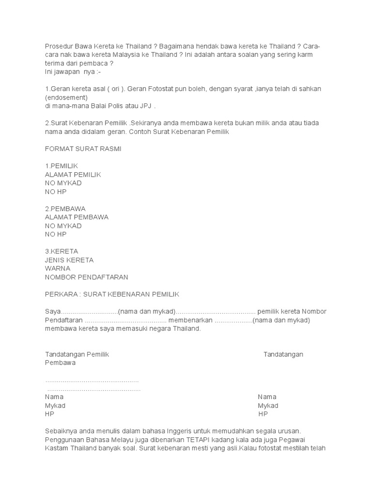 Contoh Surat Kebenaran Membawa Kereta Ke Thailand Backup Gambar